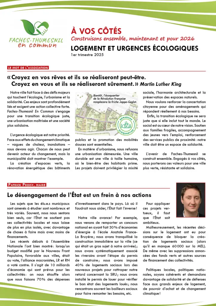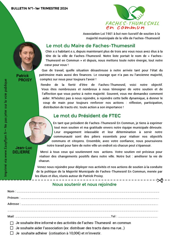 L’association Faches-Thumesnil en Commun (FTEC) a été créé en 2019, un peu avant les élections municipales de juin, autour de l’actuel Maire de Faches-Thumesnil Patrick PROISY, avec comme objectif de faire élire une nouvelle équipe municipale citoyenne, soutenue par les partis de Gauche et Écologistes, engagée pour transformer la commune et en faire une ville citoyenne, sociale, solidaire, écologique et culturelle.