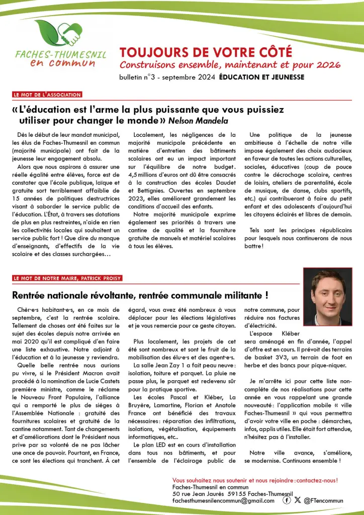 Depuis que cette nouvelle équipe gère et anime la ville avec dévouement, sérieux et humanité, nous avons décidé, à ses côtés, de poursuivre un travail de soutien et de valorisation des politiques publiques qu’elle met en place et ce malgré un contexte gouvernemental national qui abandonne les collectivités locales, contraintes de plus en plus à se substituer à l’état.